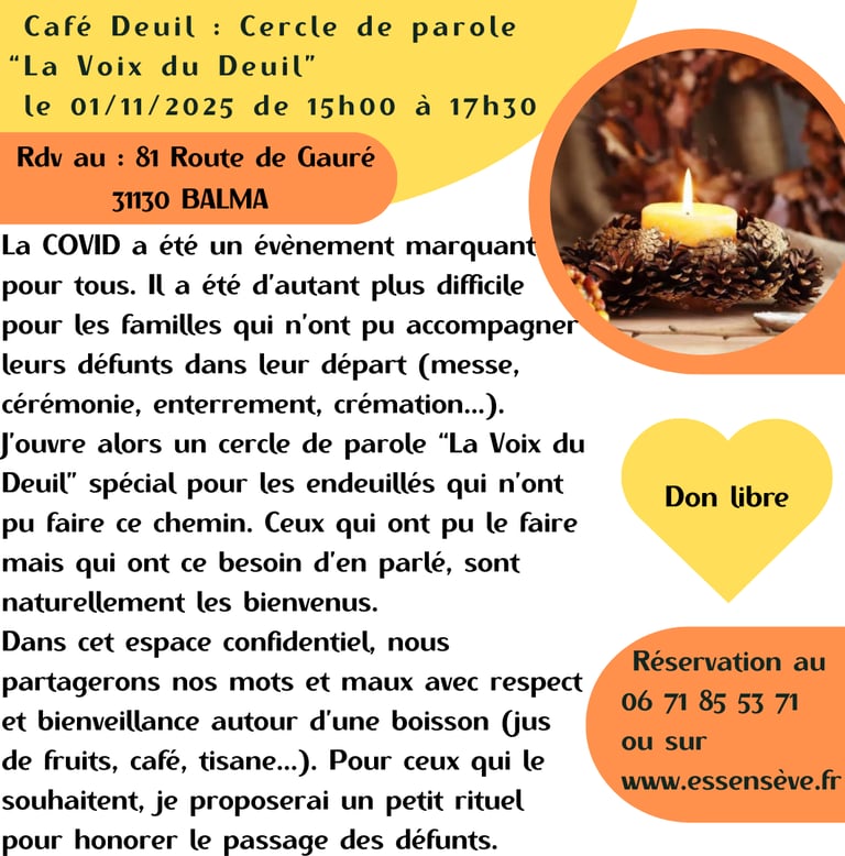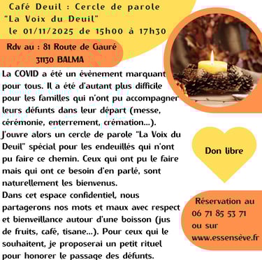 Nous traversons tous des deuils différents (perte d’une personne ou d’un animal, déménagement, maladie, départ à la retraite...) et de manière différente. En parler à son entourage n’est pas forcément évident. Je vous propose alors un cercle de parole “La voix du Deuil” pour déposer et partager en liberté. Vous pouvez aussi juste venir écouter parler de deuil. Dans cet espace confidentiel, nous partagerons nos mots et maux avec respect et bienveillance autour d’une boisson (jus de fruits, café, tisane...)